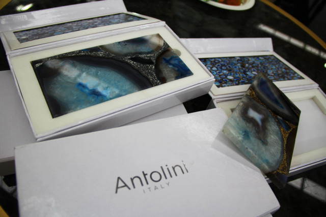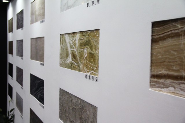 創(chuàng)新的展館設(shè)計之外,40款經(jīng)典的石材和多款意大利Antolini頂級石材一一亮相,其中,銀粉瑪瑙和金粉瑪瑙尤為引人注目,兩件產(chǎn)品都是運用很多小塊的瑪瑙,經(jīng)過意大利師傅手工的精心挑選,并由環(huán)氧樹脂拼接而成,其精細程度令人贊嘆,堪稱頂級石材。