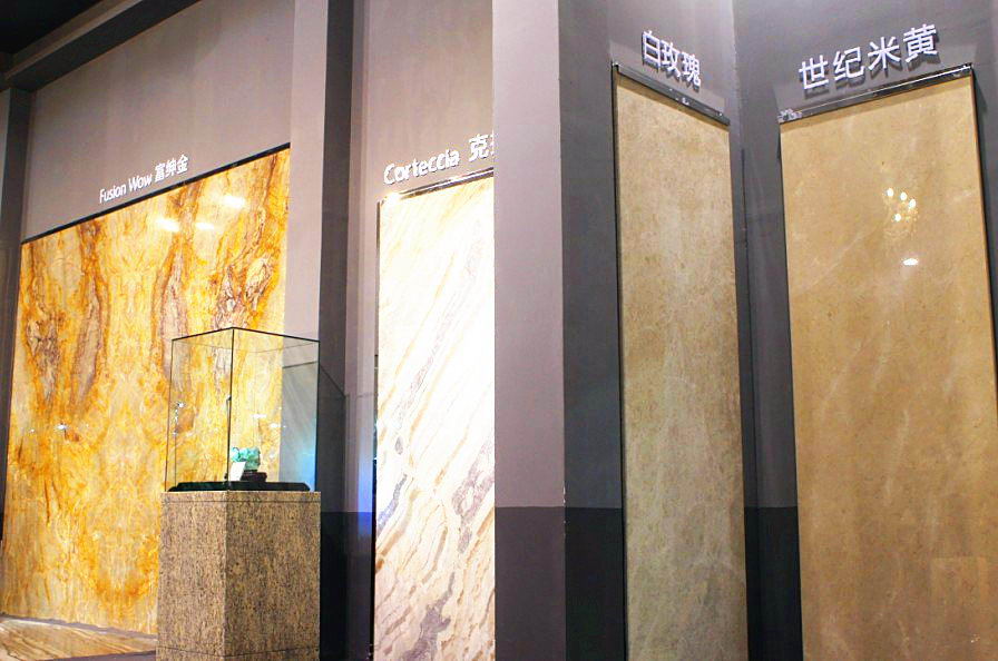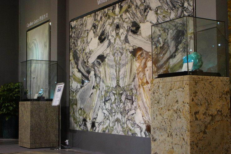 展館設(shè)計(jì)上,康利彰顯“高端、石尚、第一品牌”的品牌形象,以尊貴、時(shí)尚、高雅的石材藝術(shù)殿堂別墅形式,讓觀展者近距離感受高端石材的巧妙應(yīng)用。其中有著獨(dú)一無(wú)二紋理與特殊背光效果的玫瑰晶、紫水晶等多款天然珍稀石材極為引人矚目。