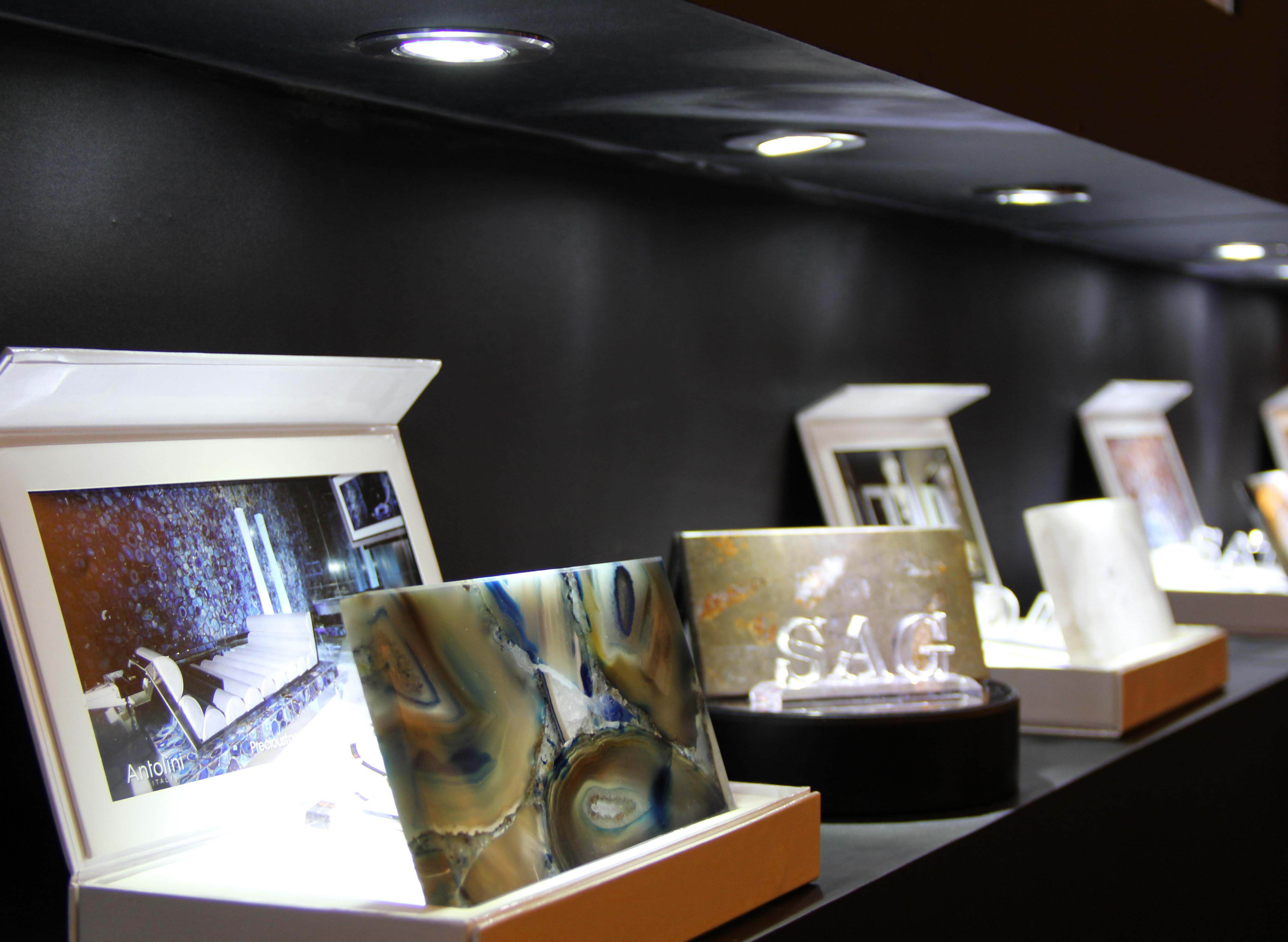 作為高端石材品牌,SAG石尚空間石材尊貴、時(shí)尚、高雅的氣質(zhì)脫穎而出?,F(xiàn)場(chǎng)采用燈箱、展臺(tái)、樣品等多種展示形式,打造最逼真的視覺(jué)效果。其中有著獨(dú)一無(wú)二紋理與特殊材質(zhì)的藍(lán)瑪瑙、紫水晶、煙晶等多款天然珍稀石材備受青睞。