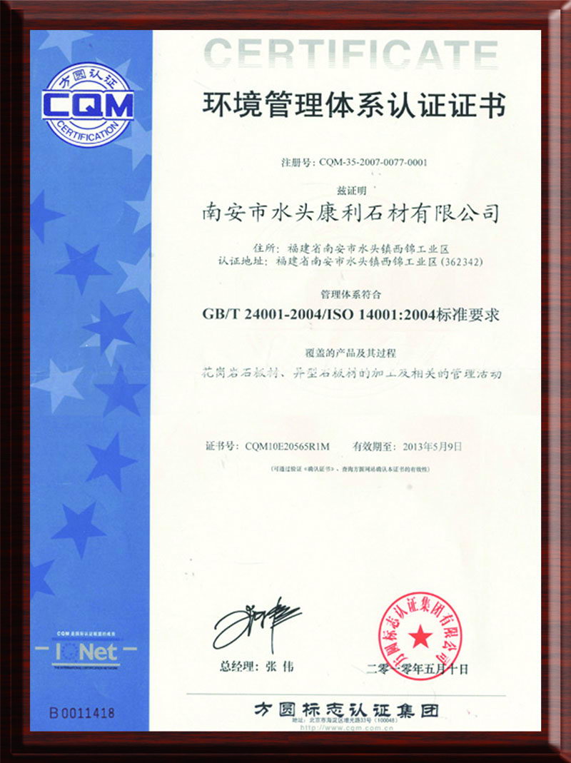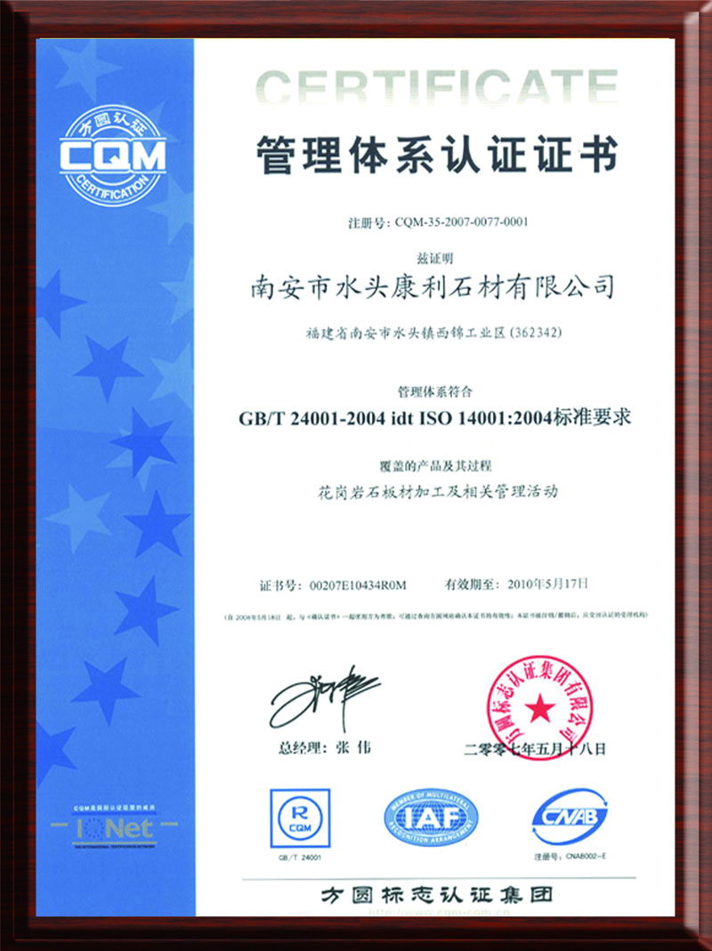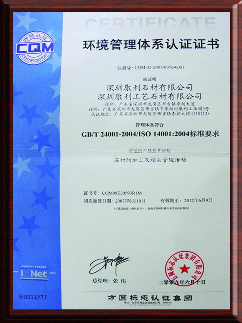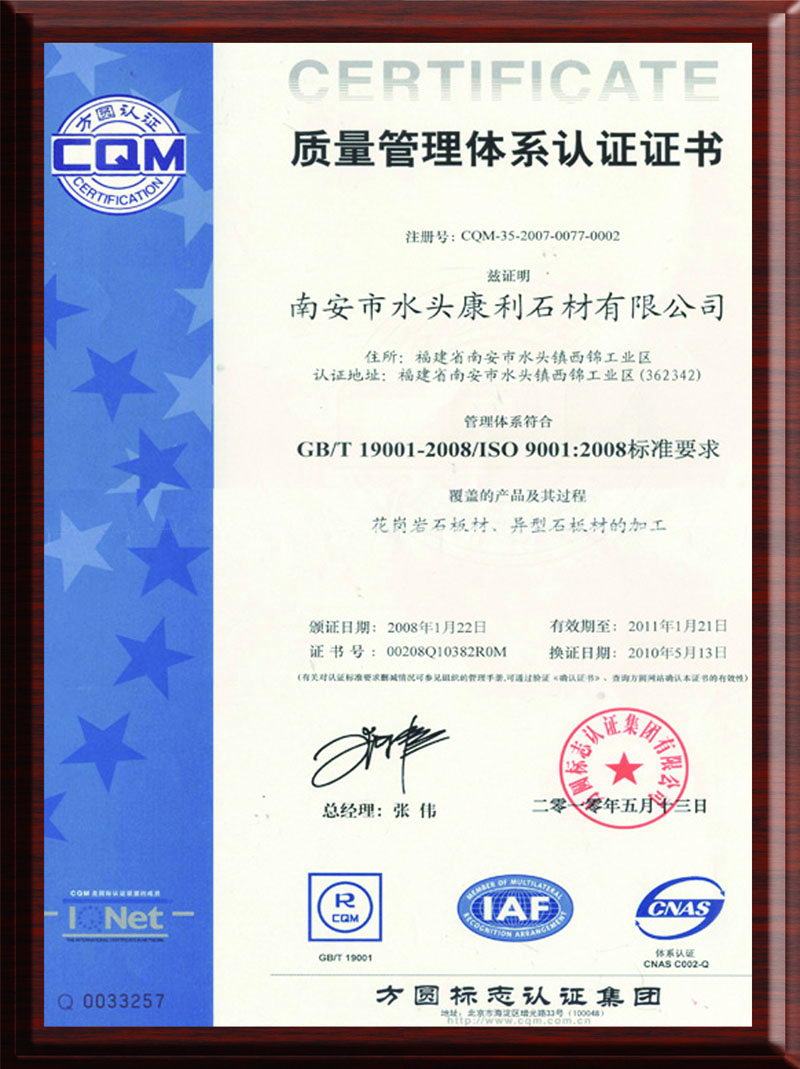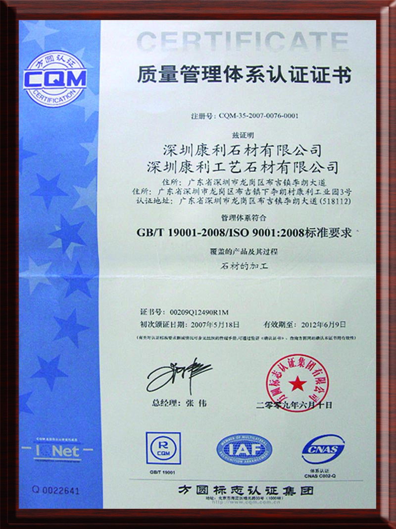 康利建立了完善的質(zhì)量保證體系,是行業(yè)中率先通過(guò)ISO9001質(zhì)量管理體系認(rèn)證、ISO14001環(huán)境管理體系認(rèn)證的企業(yè),并且是石材國(guó)家標(biāo)準(zhǔn)《天然大理石建筑板材》、《天然花崗石建筑板材》的起草單位之一。